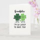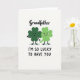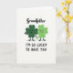 This card shows two friendly four-leaf clovers centered on a white background, drawn like little characters with thin arms and legs. The left clover is a deeper emerald green and lifts one arm in a wave, while the lighter lime-green clover leans in close with a soft pink blush, as if sharing a quiet, affectionate moment 💚. Their dot eyes and wide smiles face forward, but the tilt of the lighter clover makes the pair feel connected, like a warm bond between family or close friends. Above them, the word “Grandfather” sits near the top in a dark green cursive-style lettering. Below the characters, the message “I’M SO LUCKY TO HAVE YOU” appears in uppercase, also in green, spanning the lower portion of the design ☘️. The open white space around the figures keeps the focus on their gentle poses and the simple message. The two greens contrast clearly, with the darker clover standing straighter and the lighter one angled toward it, blush visible on its cheek.