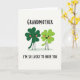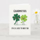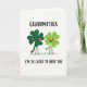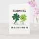 This greeting card shows two smiling four-leaf clovers standing close together on a white background, their faces turned slightly toward each other like close friends sharing a private joke 💚. The clover on the left is a deeper emerald green and a bit taller, while the one on the right is smaller in a lighter lime green, which makes their pairing feel gently protective and affectionate. Both have rosy pink cheeks, tiny black dot eyes, and curved smiles that read like a soft blush and an easy, comfortable bond. Thin black stick legs place them on a faint pale-green ground line, giving the scene a simple, airy setting. Centered near the top, the word “GRANDMOTHER” appears in black, all-caps lettering that stands out clearly against the white space. Beneath the characters, “I’M SO LUCKY TO HAVE YOU” sits in matching black text, neatly aligned and easy to read, with a little ☘️ energy in the overall color theme. The two greens work together like a small nod to shared luck and closeness, with the brighter clover seeming to lean into the darker one’s steady presence. A thin pale-green line runs under their feet, anchoring the pair in the open white space.