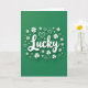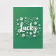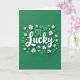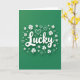 This greeting card opens on a deep emerald green background that feels like a spring field at dusk, setting a cozy, flirty mood. Centered in large white lettering is the word “Lucky,” stretching across the middle so your eye lands there first. Around it, white four-leaf clovers and smaller shamrocks float like confetti, with tiny white dots sprinkled between them like dew. Mixed in are white hearts—some solid, some outlined, and a few with polka dots—adding a sweet, close-to-the-heart touch 💚. The clovers and hearts look slightly raised, as if paper cutouts hovering just above the surface, creating soft little shadows. That gentle layering makes the whole scene feel like a shared wink between friends or a quiet squeeze of the hand on St. Patrick’s Day ☘️. Share St. Patrick’s Day sentiments with someone you care about. The white clovers, hearts, and dotted specks are scattered evenly around the central word against the rich green field.