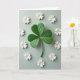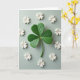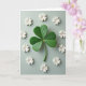 This greeting card features a centered three-leaf clover in deep emerald green, with raised-looking veins and a sculpted texture that draws the eye ☘️. It sits against a pale sage background that feels calm and airy, like a quiet moment shared side by side. Around the edges, small white four-petal flowers form a neat ring, as if they’re gently gathering around the clover the way close friends lean in together 💚. Each blossom has a tiny golden center that catches the light, adding a soft gleam without stealing focus. The lighting is diffused, creating mild shadows that make the clover and petals appear slightly lifted from the surface. Any greeting text would sit neatly at the top or bottom in a simple gold or green tone, leaving the center artwork unobstructed. The overall palette stays to sage, emerald, white, and hints of gold, with the flowers evenly spaced around the perimeter.