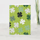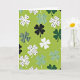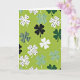 On the front of the card, a scatter of stylized four-leaf clovers drifts across a bright lime-green background, like confetti shared between close friends 💚. Some clovers are fully shown while others are cropped at the edges, giving the scene an easy, all-over pattern that feels like it continues beyond the card. The clovers alternate between deep forest green, emerald, black, and white, creating a lively rhythm without any shading. Several designs add extra charm: white clovers with small black polka dots, and green clovers filled with white stripes that run vertically or diagonally ☘️. There’s no character figure, but the mix-and-match clovers read like a quiet back-and-forth—different, yet clearly meant to belong together. Any greeting text can sit neatly centered or near the top in dark green or black so it stands out against the lime field. The flat, graphic look keeps every leaf edge crisp, with patterned clovers sprinkled evenly among the solid ones.