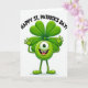 This card features a cheerful, one-eyed green creature centered on a bright white background, greeting you like an old friend with its arms stretched wide for a hug 💚. Its round body and slim legs give it a friendly cartoon look, and a glossy four-leaf clover sits around its head like a lucky crown ☘️. The single large eye has a bright green iris that seems to lock onto you with an eager, affectionate gaze, while a wide grin shows white teeth and a red tongue as if it’s calling out hello. Smooth shading and gentle gradients make the character look slightly sculpted, with soft highlights that add shine to the clover. Across the top, black uppercase text curves in an arc and reads “HAPPY ST. PATRICK’S DAY!”, standing out sharply against the white space. The lettering sits above the character’s head, leaving the center clear so the clover and eye remain the main focus. The overall layout is simple and open, with lots of white space that frames the green figure and keeps your attention on its welcoming pose. The clover’s four leaves have rounded heart-like shapes with glossy highlights and subtle shadowing along the edges.