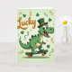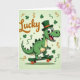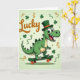 Designed with an emerald-green theme, the front shows a cheerful cartoon T‑Rex riding a dark green skateboard with bright orange wheels, leaning forward as if showing off for a friend 💚. It wears a green top hat with an orange band, and its wide eyes and open smile feel more like a friendly grin than a roar. The background is a soft green gradient that keeps the scene calm while the dinosaur’s motion adds energy. Near the top, the word “Lucky” sits above the character in burnt orange lettering, echoing the orange accents on the hat and skateboard. Small shamrocks float around the dinosaur in darker green, with a few curling orange streamers weaving between them ☘️. The scattered details give the space a light, celebratory feel, like a fun moment shared on a sunny afternoon. A gentle green gradient fills the backdrop while shamrocks and orange swirls are sprinkled across the open space.