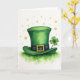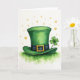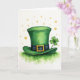 This design shows an emerald green top hat centered on a white background, painted with soft watercolor-like washes that fade from deep shadows along the brim to lighter highlights on the crown. A dark band wraps the base of the hat, and a golden buckle sits front and center, catching the light like polished metal. From under the brim, a single three-leaf clover peeks out ☘️, as if it’s being offered like a small, sweet token between friends. Around the hat, tiny gold specks scatter upward in a loose arc, like glitter drifting through the air. The green tones pool near the bottom edge in a hazy, grass-like blur, giving the hat a gentle place to “stand” without a hard line. The greeting “Happy St. Patrick’s Day” appears above the hat in green lettering, while a smaller line of text sits below in matching green, neatly centered. Flecks of gold hover near the top corners, with the brightest cluster sparkling just to the right of the crown 💚.