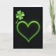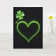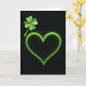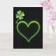 This card centers on a glowing neon-green heart that looks almost liquid as it shines against a deep black background 💚. The heart’s soft halo spreads outward, like a quiet warmth shared between two people in the dark. In the upper left corner, a four-leaf clover ☘️ sits with gently textured leaves in a slightly softer emerald green, as if it’s leaning in to keep the heart company. Its curved stem arcs toward the heart’s top edge, creating a tender, close-by connection in the layout. Any greeting text is kept minimal and placed low beneath the heart, set in small green lettering that doesn’t compete with the glow. The strong contrast makes the two symbols feel like they’re meeting in the same night-sky space, one offering luck and the other offering affection. The clover’s leaf veins are lightly detailed, while the heart remains smooth and glassy with a bright green outline and a faint green haze around it.