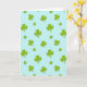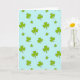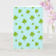 This greeting card features a field of lime-green shamrocks scattered across a soft pastel sky-blue background, like lucky notes drifting through spring air 💚. Each three-leaf clover has rounded, heart-shaped leaves and a short stem, edged with a deeper emerald outline that gives the pattern a gentle, close-knit feel. The shamrocks vary a bit in size and angle, so your eye moves around the card the way two friends might wander side by side, spotting little signs of good fortune. There’s no busy scene—just open blue space that makes the greens stand out and keeps everything light and airy. Any text would sit most naturally at the top or center in a matching emerald green, leaving the clover pattern to frame it without crowding. The overall look feels like a small shared secret between you and the recipient, sweet and easy, with a touch of Irish charm ☘️. Share St. Patrick's Day sentiments. The front is filled edge to edge with clovers, each outlined in dark green against the calm blue field.