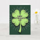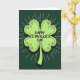 This greeting card features a large four-leaf clover in bright lime green set against a deep forest-green background, giving the scene a festive St. Patrick’s Day look ☘️. Each heart-shaped leaf is edged with thick black outlines, and curling line details inside the leaves add a cozy, doodled touch that feels like a friendly wink. The clover sits centered, as if it’s being offered straight to someone you care about, with an inviting, close-up focus that reads as warm friendship 💚. The words “HAPPY ST. PATRICK’S DAY” appear in black, slightly shadowed lettering placed across the upper leaves, standing out clearly against the green. Behind the clover, thin white rays spread outward in a loose circle, like a soft burst that frames the message. A faint shadow beneath the clover lifts it off the background, adding depth without changing the simple layout. The overall palette stays in greens with crisp black and white accents, and the radiating white lines form a bright halo around the centered shamrock.