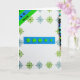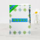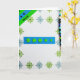 This card shows a bright white background with a cerulean-blue stripe running through the middle, where five lime-green four-leaf clovers line up and shrink slightly from left to right for a sweet, steady rhythm ☘️. Around the stripe, stamped starburst-flower shapes repeat in green and muted teal, like a gentle frame that keeps everything together. In the upper-left corner, a diagonal patch of chartreuse and azure cuts in, dotted with tiny black dots and one thin black mark, adding a sharp little contrast. Along the right edge, a beaded strand hangs down with glossy black, milky white, turquoise, royal blue, and lime beads, spaced with small gold accents that catch the light. The close arrangement of clovers and the soft framing pattern feels like an affectionate nudge between friends, with the beads trailing beside them like a companion walking along 💚. There’s no text on the front, leaving the center stripe and clover row to do all the talking in color and shape. Bright, even lighting makes the white ground, teal stamps, and gold bead highlights stand out clearly beside the blue stripe.