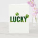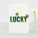 This card features the word “LUCKY” centered on a bright white background, with each large uppercase letter filled with layered green tones that look like soft moss and leafy texture. The greens shift from light to deep shades, giving the letters a fresh, living look that feels like a gentle shared stroll through spring. A small shamrock grows up from the curve of the “U,” its stem blending into the letter as if it’s reaching toward someone nearby. A four-leaf clover sits on the upper tip of the “Y,” like a quiet little sign of extra good fortune shared between friends 💚. There’s no other scene crowding the space, so the airy white setting keeps the focus on the greenery and the calm, close feeling it suggests. The text is the main design element, and the only lettering is “LUCKY,” with no shadowing or outline, just the green foliage pattern inside the letters. Two shamrocks punctuate the word—one attached to the “U” and one crowning the “Y”—with their crisp leaf shapes standing out clearly against the white field ☘️.