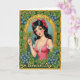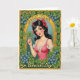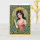 This card features a vintage-style St. Patrick’s Day scene with a young woman at the center, her dark hair topped with a bright red bow and her large blue eyes meeting yours with a tender, friendly smile 💚. She wears a pink dress trimmed with white lace and touched with gold along the neckline and off-shoulder sleeves, giving her a dressed-up, date-night look. Framed inside a glowing golden arch, she reaches forward as if offering you a four-leaf clover, the gesture feeling like a small, sweet invitation between close friends. The clover is a rich green and held delicately between fingers with glossy red nail polish, drawing your eye straight to the lucky charm ☘️. Around the arch, the background fills with deep emerald green and a border of shamrocks mixed with small blue blossoms, like a garden garland wrapping the scene. At the top, gold lettering reads “Greetings Good Luck,” and at the bottom, matching gold text says “St. Patrick’s Day,” both set against the green backdrop for contrast. Share St. Patrick’s Day sentiments with someone special. The golden arch glows against the emerald field while shamrocks and blue flowers cluster along the edges.