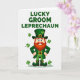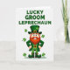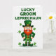 This card features an anthropomorphic leprechaun standing front and center on a white background, posed with hands on hips as if he’s proudly showing up for someone special. His russet beard and mustache frame rosy cheeks and bright blue eyes that seem to glance out with a friendly, flirty confidence 💚. He’s dressed head to toe in rich green clothing, including a tall top hat with a four-leaf clover and a shiny gold buckle, plus a matching coat, waistcoat, trousers, and buckled shoes. A few small green shamrocks float around him, like little lucky tokens drifting through the air ☘️. The romantic “groom” angle comes through in how polished and put-together he looks, like he’s ready to charm his sweetheart or toast close friends at a celebration. Across the top, the phrase “LUCKY GROOM LEPRECHAUN” appears in emerald-green uppercase letters, centered above his hat. The gold buckle on his hat catches the light, with the clover sitting just above it and the scattered shamrocks spaced around his shoulders and sides.
