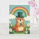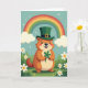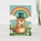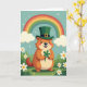 At the center of the card is a plump, groundhog-like character in warm amber and cream, smiling with bright eyes and a soft rosy blush as if it’s sharing a sweet moment with you. A leprechaun-green top hat with a golden buckle sits neatly on its head, adding a friendly St. Patrick’s Day touch 💚. In its small paws, it gently holds a four-leaf clover, close to its chest like a little gift meant for someone special ☘️. Behind it, a pastel blue sky sets a calm scene, while a rainbow stretches across the upper area in soft bands of color. Two fluffy white clouds sit near the rainbow, balancing the top of the design and keeping the mood light. Along the bottom, emerald grass is sprinkled with tiny white daisies and small shamrocks, creating a cozy meadow setting. The greeting text appears near the top in green, standing out against the sky without overpowering the illustration. Fine sparkles are scattered around the character and across the sky, like tiny stars caught in the daylight.
