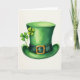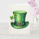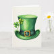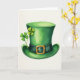 Designed with a watercolor look, the front shows a leprechaun’s top hat centered on a creamy background, its greens shifting from deep emerald at the brim to lighter lime on the crown 💚. Soft, diffused light and gentle shadows make the hat feel rounded and close, like it’s been set out for someone special to find. A dark band wraps around the hat, and two shamrocks are tucked into it—one with three leaves and one with four—leaning together like close friends ☘️. Their fresh green leaves and lightly striped stems add a tender, natural touch against the hat’s structured shape. A burnished gold buckle sits on the band, catching the light with a warm gleam that breaks up all the green. There’s no text on the front, keeping the focus on the hat and the small details. The hat’s brushy edges and layered washes are visible, with the brightest highlight along the upper right of the crown and the deepest shadow under the brim.