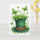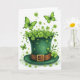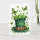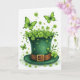 This greeting card features an emerald-green top hat centered on a bright white background, with a rich cluster of shamrocks spilling out as if they’re being offered to someone special 💚. The clovers range from light mint to deeper forest green, fanning outward from the brim and gathering around the base like a small green bouquet. Three green butterflies float nearby, their softly veined wings angled toward one another in a gentle, companionable orbit ☘️. A warm brown leather band wraps the hat, and a small golden buckle catches the light with a subtle gleam. Near the top, the St. Patrick’s Day message sits in green lettering, balanced so it doesn’t crowd the illustration. Additional small text appears below in a lighter green, leaving plenty of open white space around it. The hat’s crown shows a smooth watercolor texture, and the shamrocks look layered and slightly scattered along the lower edge of the design.