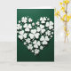 This card features an overhead view of a heart shape built from small white shamrocks and tiny star-like flower pieces, arranged like a shared secret between close friends. The shapes sit on a deep emerald green background that brings St. Patrick’s Day to mind right away ☘️. Soft, diffused light creates gentle shadows under each white piece, giving the heart a floating, touchable look. The mix of larger and smaller clovers adds a tender rhythm, like two people leaning closer as the heart curves inward. A few petite four-petaled bits are sprinkled through the design, like little sparks that make the arrangement feel a bit more intimate 💚. The greeting text is placed above the heart in white lettering, with a smaller line below in matching white to balance the layout. The white clovers stay crisp against the dark green surface, with the heart centered and the tiny accents scattered evenly around its edges.
