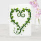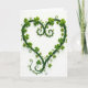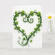 This greeting card features a heart shape formed from a twisting green vine, set against a bright white background that makes every leaf stand out. The vine heart is packed with shamrocks and a few four-leaf clovers, their rounded leaves overlapping like a close embrace between friends or sweethearts 💚. Soft, even light brings out layers of emerald, lime, and forest green, giving the greenery a fresh, just-sprung-from-the-garden look. The vine itself has a lightly ridged texture, while the clover leaves look smoother and softer, creating a gentle contrast you can almost feel. Thin tendrils curl outward from the heart, as if reaching toward someone nearby, and a few tiny star-like buds appear at their tips ☘️. The greeting appears near the top in medium green lettering, with a smaller line of text centered near the bottom in a lighter green for balance. A few curling tendrils extend past the heart’s edges, with small buds dotting the ends.