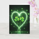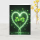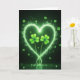 This card design shows two glowing four-leaf clovers nestled together inside a large heart made of tiny, sparkling green particles, set against a deep black background 💚. The clovers’ leaves shift from bright electric green near the heart’s top to darker emerald tones toward the edges, giving them a softly lit, almost glassy look. Their stems cross and twist at the base like hands gently clasping, suggesting closeness and steady companionship ☘️. A faint green reflection appears on the dark surface below, as if the heart is hovering just above a polished tabletop. Small, translucent shamrocks float around the main heart like drifting confetti, adding depth to the surrounding darkness. The greeting text sits near the top in light green, standing out clearly against the black space without crowding the artwork. The heart’s edges sparkle with scattered points of light, and a few tiny shamrocks fade into the corners.