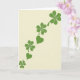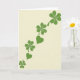 This card features a soft, warm cream background with a diagonal trail of green shapes rising from the lower left to the upper right. Along the path, three three-leaf clovers appear in textured green with fine white lines inside, like gentle veins, and they alternate with two smooth green hearts. The way the clovers and hearts take turns feels like a quiet back-and-forth between close friends or sweethearts, each symbol leaning into the next as they climb. Near the top, simple St. Patrick’s Day text sits lightly in green, leaving plenty of open space around it. The green stands out clearly against the cream, giving the icons a fresh look without shouting. A small 💚 and ☘️ can be tucked near the lettering to echo the theme without crowding the design. The clovers and hearts keep the same angle and spacing, forming an easy diagonal rhythm across the front.