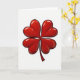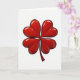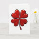 This card features a four-leaf clover formed from four glossy red hearts, centered on a bright white background for a simple, striking look 💚. Each heart is rounded and slightly plump, with shiny highlights that make it look like polished enamel or candy. Fine, lightly raised vein-like lines spread from the middle into each heart, adding texture and a gentle, growing-together feel, like four close friends leaning in. A dark, crisp outline traces every heart and the slim stem below, giving the shape strong definition. Near the top, a short St. Patrick’s Day greeting sits above the clover in green lettering, balanced and easy to spot ☘️. The open white space around the design keeps all attention on the clover-heart cluster and its tender, romantic twist. The stem tapers downward in a smooth curve, ending just below the clustered hearts.