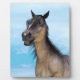 3D digital render of a cute smiling grulla horse with blue eyes on blue sky background. Perfect gift for everyone who loves fun and laughs