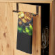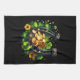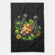 Kitchen towel with a St. Patrick's Day themed image. A black and gold horseshoe sitting in a bed of green clover with shiny gold coins.