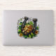 Contour sticker with a St. Patrick's Day themed image. A black and gold horseshoe sitting in a bed of green clover with shiny gold coins.