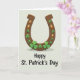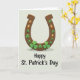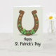 This card features a sturdy brown horseshoe centered on a muted off-white background, with soft lighting that makes its rounded shape look smooth and inviting. Tucked along the inner curve, layers of green shamrocks range from tiny clovers to larger glossy three-leaf clusters, creating a cozy, gathered-together look 💚. Between the leaves, small golden teardrop shapes glint like little charms, adding a gentle sparkle without crowding the design ☘️. The greens shift from lighter to deeper tones, giving the clovers a slightly raised, touchable feel. A faint drop shadow under the horseshoe lifts it off the page, like it’s hovering just above the surface. Near the bottom, the words “Happy St. Patrick’s Day” sit as a single line in black lettering, centered and easy to read. The horseshoe’s inner edge is lined with clovers that thicken toward the base, where the green clusters feel most dense and glossy.