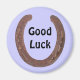 Photograph of rusty horseshoe hung so the luck won't run out. Text and background color customizable.