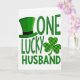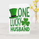 This card features a festive green-on-white design centered around the phrase “ONE LUCKY HUSBAND” in three stacked lines, with the letters in rich green that stands out sharply. A leprechaun hat sits at the upper left, shaded with gentle gradients so it looks slightly raised, and a darker band wraps around it for contrast. To the right of the word “LUCKY,” a three-leaf shamrock appears like a sweet little companion, hinting at affection through how closely it tucks in beside the text. The shamrock is filled with a plaid pattern in multiple green tones, adding texture that feels cozy and traditional. Different greens—emerald, forest, and lime—move across the elements, giving the layout depth without crowding the open white space. The words are centered and easy to read, with “ONE” on top, “LUCKY” in the middle, and “HUSBAND” along the bottom, creating a steady, balanced look. Small touches of ☘️ and 💚 fit naturally with the lucky theme and the romantic “husband” message. The hat remains angled slightly left while the patterned shamrock sits to the right, framing the middle line against the bright white background.