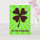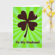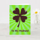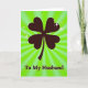 This greeting card features a near-black four-leaf clover made of heart-shaped leaves, set against a bright lime green background that feels like it’s glowing from within 💚. Radial rays spread outward from behind the clover, giving the scene a sunburst look that frames the symbol like a spotlight on a cherished bond. Tiny star-like sparkles hover around the clover, especially near the top, as if little glints are winking at two people who share an inside joke ☘️. The heart-shaped leaves suggest a steady, affectionate connection, like a quiet squeeze of the hand that says “I’m with you.” At the bottom, the words “To My Husband” sit centered in a dark, easy-to-read font that matches the clover’s silhouette. The strong contrast between the dark clover and the bright green field keeps the focus on the romantic message without adding extra clutter. The background rays shift from lighter to deeper green as they radiate outward, and a few scattered sparkles punctuate the space around the clover’s upper edges.