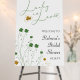 Lucky in Love bridal shower welcome sign with elegant calligraphy, green and gold shamrocks and four leaf clover wildflowers. Perfect for spring bridal shower with green, St Patricks or Irish theme.