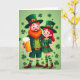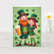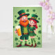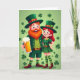 This card shows a cheerful St. Patrick’s Day scene with a smiling man and woman standing close together in the center, their shoulders touching as she leans into him with an affectionate, friendly gaze 💚. He wears a tall green top hat over bright red hair, and a thick orange beard spills down his chest as he lifts a foamy mug of golden ale. She has flowing red hair and a green hat with a small shamrock detail, and her posture angles toward him as if they’re sharing a private joke. Their outfits are rich emerald with gold buckles, and their striped socks add extra color near the bottom of the design. The main greeting text sits across the upper area in green lettering, with smaller accent words placed below in a lighter shade for contrast ☘️. Behind them, a soft lime-green gradient fills the background, sprinkled with darker green shamrocks in a loose pattern. The scene is framed by the gentle fade of the green backdrop and the repeating shamrock shapes around the couple.