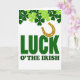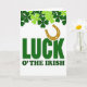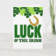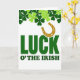 This design shows a bright white background topped with a leafy border of shamrocks in deep emerald and fresh lime, like a little crown of clover overhead. The clovers mix solid fills with fine outlines, creating a light, flirty rhythm that feels like friends leaning in close for a shared laugh 💚. Centered on the card, the phrase “LUCK O’ THE IRISH” sits in rich green lettering, taking up most of the middle space. A golden horseshoe rests above the “U” in “LUCK,” arcing neatly into the layout with tiny nail-hole details that make it look real and treasured. The contrast of green and gold against the white space keeps everything crisp and easy to read, with the border drawing your eye down toward the message. The overall look suggests a warm exchange—like someone handing this over with a soft smile and a gentle squeeze of the hand ☘️. The shamrock border stays along the top edge, while the green text remains centered beneath it and the horseshoe glows in warm gold above the word “LUCK.”