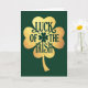 This card features a large four-leaf clover centered on a deep emerald green background, with a brushed gold look that feels like a cherished keepsake you’d pass to a close friend 💚. Across the middle of the clover, the phrase “LUCK OF THE IRISH” sits neatly inside the leaf shapes, carved out so the dark green background shows through. The letters use a classic serif style with gentle shadowing that makes the cut-out text look slightly pressed into the gold. A tiny four-leaf clover replaces the “O” in “OF,” adding a sweet little nod that reads like an inside joke between two people who know each other well ☘️. Fine texture lines in the gold surface catch the light, giving the clover a soft shimmer without overpowering the design. The layout stays symmetrical and focused, keeping your eyes on the clover and the message running straight across its center. At the very center, the small clover “O” is ringed by delicate radiating lines that subtly anchor the words against the green field.