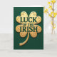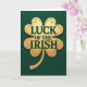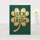 This card shows a large four-leaf clover centered on the front, finished in antique gold with a soft metallic shine that catches the light. Each leaf is edged with fine lines and filled with recessed swirl details that echo Celtic knot patterns, giving it a treasured, keepsake look. Across the middle of the clover, the words “LUCK OF THE IRISH” sit in dark emerald green, set in a classic serif style that feels steady and traditional. The text runs horizontally from left to right, clearly placed over the brightest part of the gold so it stands out at a glance. Behind the clover, a deep forest-green background creates a cozy, close-knit setting—like friends gathered shoulder to shoulder for a toast 💚. Gentle shading around the clover adds depth, making it look raised as if you could trace the edges with a fingertip. The gold and green pairing nods to St. Patrick’s Day cheer ☘️, while the careful detailing suggests a quiet, affectionate attention to whoever receives it. Subtle gradients and shadows collect along the outer curves of the leaves, with the darkest tones pooling near the edges against the green backdrop.