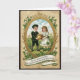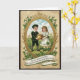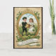 This card features a vintage-style illustration set inside an ornate gold oval frame, with tiny white clover blossoms and three-leaf clovers tucked into the decoration and small harp shapes along the sides. In the center, a young boy and girl stand close together in a green meadow dotted with little wildflowers beneath a pale, cloud-speckled sky 🌷. The boy wears a deep green suit with knicker-style shorts and a matching cap, and he leans in as he helps hold one side of a golden pot brimming with coins. The girl, in a white ruffled dress with green ribbons and a matching headband, steadies the other side, her posture angled toward him like they’re sharing a secret task. Their rosy cheeks and soft expressions suggest a shy friendship, with their hands meeting at the pot as if they trust each other to carry it. Around the vignette, the background is a warm, aged cream tone with faint timeworn marks, and a curling banner runs along the bottom with a short message printed in dark lettering. The gold frame gleams against the cream paper, and the banner’s ends curl upward beneath the clover accents 🐇.
