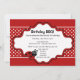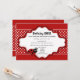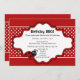 A vibrant invitation that features a cute ladybug within a decorative flourish. The red backdrop has a wide band of white polka dots.