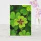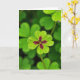 This card features a close-up four-leaf clover in bright lime green, with a deep maroon cross-shaped mark at the center that draws your eye right in ☘️. Each heart-shaped leaflet looks slightly translucent, with fine veins and a soft sheen that feels like a quiet invitation to lean closer. The background fades into gentle, out-of-focus greens—from light emerald to darker forest tones—so the clover stands out like a small treasure. Soft, diffused lighting smooths the scene and keeps the contrast gentle, giving the clover a calm glow. A simple St. Patrick’s Day greeting sits near the top in green lettering, balanced by a shorter line near the bottom in a darker shade that echoes the maroon center 💚. The spacing leaves plenty of breathing room around the clover, like the design is giving it center stage for a shared moment between close friends. The maroon mark sits right where the four leaflets meet, crisp against the luminous green while the surrounding foliage stays blurred in the distance.
