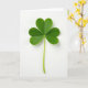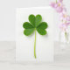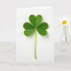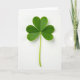This greeting card shows a three-leaf clover centered on a bright white background, its heart-shaped leaflets opening like three small green hearts leaning toward one another 💚. The green is fresh and luminous, and the fine veins across each leaf are easy to spot under even, bright lighting. The leaflets slightly overlap at the middle, giving the clover a close, friendly feel, like a quiet hug shared between two people. A slim, pale green stem drops straight down from the center, keeping the whole design calm and balanced. Near the top, the greeting text sits in a soft green color, spaced neatly so it doesn’t crowd the clover ☘️. The rest of the space stays open and airy, with no extra objects, so your eyes settle on the gentle shapes and textures. Faint shadows fall just beneath the leaves, and a tiny bit of soft fuzz along the edges adds a natural, touchable detail.
