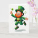 This card shows a leprechaun caught mid-leap in the center, his emerald suit and tall green hat trimmed with a small shamrock and a gold buckle. Set against a bright white background, crisp highlights along his jacket and hat make the greens, golds, and orange-red beard stand out. His wide grin and sparkling blue eyes feel like he’s sharing a friendly secret with whoever opens the card, adding a gentle touch of closeness to the scene 💚. In his raised hand, he holds a large four-leaf clover in rich green, angled slightly outward as if offering it for good luck ☘️. Faint, softly blurred shamrocks drift around him like a light trail, keeping the space airy while framing his jump. The greeting text sits near the top in green lettering, with a smaller line below it in gold for contrast. Around the leprechaun, the floating shamrocks vary in size and fade softly at the edges against the white.
