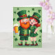 This card shows a stout, red-bearded leprechaun-like fellow in an emerald suit and tall green hat with a gold buckle, lifting a foamy pint of amber ale as if to toast you 💚. Tucked close under his arm is a red-haired companion in a matching green hat, her hair spilling down as she leans in with an easy, friendly closeness. She wears a green dress with shiny gold buttons, striped green socks, and curled-toe shoes that add a storybook touch. Their wide smiles and bright eyes meet at a slight angle, like they’re sharing a private joke in the middle of the celebration ☘️. Behind them, a soft green gradient sets a gentle stage, making their reds and greens stand out without looking harsh. Small shamrocks drift around the pair, filling the open space and framing their faces. Any greeting text sits near the top in light gold lettering, leaving the characters to dominate the center. The gold buckles, the froth on the drink, and the scattered shamrocks are the sharpest details against the smooth green background.