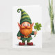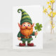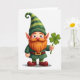 This card shows a classic leprechaun standing proudly in the middle of a bright white background, as if he’s stepped forward to greet a friend. He’s dressed head to toe in rich greens, with a deep forest jacket and trousers, plus striped accents on his extra-tall, curled hat and snug socks. A fiery orange beard frames his round face, and his dark, expressive eyes and rosy nose give him a friendly, inviting look that feels like a warm wink shared between close pals. In his right hand, he holds out a neat four-leaf clover ☘️, offered like a small token meant for someone special. The belt buckle shines in gold, adding a little sparkle against the green outfit, while his sturdy shoes are a deep maroon with a rounded shape. The greeting text sits above him in green lettering, centered and easy to spot, with a smaller line of text below in a lighter green that balances the layout 💚. Subtly pointed ears peek out from under the hat, and the striped hat tip curls upward against the white space.