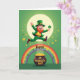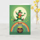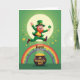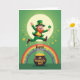 This greeting card shows a cheerful leprechaun caught mid-leap, dressed in emerald green with a tall hat topped by a four-leaf clover, his red beard framing a wide grin as if he’s jumping toward someone he’s glad to see 💚. One hand lifts in a friendly wave while the other holds up a shamrock, like a small, flirty hello shared across the room. Behind him, a pale yellow circle sits high on the card like a soft spotlight, making his pose stand out against the lighter background. Below, a rainbow curves across the lower half, leading the eye to a dark brown pot overflowing with bright gold coins, adding a wink of treasure at the end of the arc 🌈. The greeting “Happy St. Patrick’s Day!” appears on the front of the pot in light lettering that contrasts clearly against the dark surface. Around the main scene, small gold four-leaf clovers and tiny yellow flowers drift in the air, as if they’re floating between friends. A strip of green grass runs along the bottom edge, grounding the rainbow, the pot of gold, and the scattered clovers in a simple field setting.