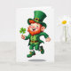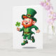 This card features a classic leprechaun centered on a bright white background, drawn in rich greens with a lively orange beard and hair ☘️. He’s caught mid-step with one foot lifted, as if dancing his way toward someone just off the page, and his wide grin and rosy cheeks feel like an invitation to join in. A tall green top hat sits above his closed, smiling eyes, with a shiny gold buckle catching the light. In his raised left hand, he proudly holds a four-leaf clover in a deeper green, like a small gift meant for a close friend 💚. His green coat and darker waistcoat look neatly fitted, with matching gold buckles on his belt and shoes for a touch of sparkle. The St. Patrick’s Day greeting appears near the top in green lettering, balanced by a smaller line of text near the bottom in a darker green. The overall look is smooth and slightly glossy, with crisp edges that make the leprechaun stand out against the plain white space. The clover’s four rounded leaves are shaded from dark to light green, with a short stem angled toward his coat pocket.