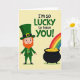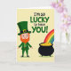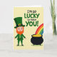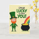 Designed with a creamy yellow background, the scene centers on a friendly cartoon leprechaun at left and a pot of gold at right, setting a sweet St. Patrick’s Day mood 💚. The leprechaun wears a green top hat with a gold buckle, has an orange beard, and smiles with arms open as if greeting someone close. Across from him, a black cauldron spills shiny gold coins, and the treasure feels like it’s waiting to be shared. From the upper right, a rainbow 🌈 curves down in clear bands of red, orange, yellow, green, blue, and purple until it meets the pot. Near the top, the phrase “I’m so LUCKY to have YOU!” sits across the upper half, with “LUCKY” in deep green and the rest in a darker contrasting tone for easy reading. The layout leaves breathing room around the characters, so the leprechaun’s welcoming stance and the rainbow’s arc read like a warm exchange between friends. The gold coins cluster at the rim of the cauldron while the rainbow’s end touches down right beside them.