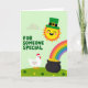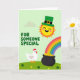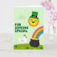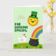 This greeting card shows a gently rolling green hillside sprinkled with small shamrock flowers, setting a cozy scene for St. Patrick’s Day 💚. In the upper right, a bright yellow sun wears an emerald leprechaun hat and smiles with rosy cheeks, as if beaming down on someone it adores. A rainbow 🌈 curves across the sky and leads the eye to a classic black pot near the ground, overflowing with shiny gold nuggets. In the lower left, a round white chicken stands nearby with a curious tilt to its head, like it just wandered over to share the discovery with a close friend. The soft lighting keeps everything smooth and sunny, with no sharp shadows, so the colors feel gentle and welcoming. Mid-left, the words “FOR SOMEONE SPECIAL” appear in bubbly green letters that stand out clearly against the lighter green background. The rainbow’s stripes are neatly stacked from red through violet as they sweep down toward the pot of gold.