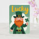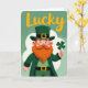 Designed with a sweet, stylized leprechaun centered in a tall layout, this St. Patrick’s Day illustration leans into Irish folklore with an easy, friendly charm 💚. He wears layered greens—from a deep forest top hat with a small buckle to a softer green tunic—set against a muted sage background. A full, fiery orange beard and mustache frame his rosy cheeks and wide, gentle eyes, giving him a look that feels like he’s sharing a private joke with a close friend. In his right hand, he holds a neat four-leaf clover ☘️, and a soft glow circles his head like a quiet spotlight. The word “Lucky” sits above him near the top, written in golden lettering that stands out warmly against the green. The artwork has a brushed, slightly textured finish that adds depth to the simple shapes without getting fussy. The edges of the background look faintly worn, and the clover’s dark green leaves are crisply defined beside his curled orange mustache.