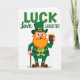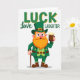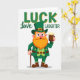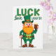 This card shows a classic leprechaun centered on a bright white background, smiling with an easy, friendly look that feels like he’s sharing the moment with you 💚. He wears a tall green top hat with a gold buckle, a matching green jacket and vest, and green trousers in slightly different shades that add depth without getting busy. His flowing orange beard frames a rosy nose and wide eyes, giving him a mischievous, warm expression like he’s in on a sweet joke with a close friend ☘️. In one hand he steadies a brown wooden walking stick, and in the other he lifts a frothy mug of dark ale as if toasting someone just out of view. Above the character, the word “LUCK” sits in large green letters edged in orange, standing out clearly against the white space. Nearby, “Love” appears in a smaller, flowing style, while “LAUGHTER” is set in sturdy uppercase, all arranged across the top area for an easy read. The greens, orange beard, and golden hat buckle create a lively contrast, with the leprechaun posed mid-celebration beneath the stacked headline text.