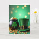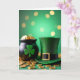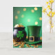 This design shows a matte black pot on the left overflowing with golden coins, set beside a green leprechaun hat that sparkles like it’s catching candlelight. The pot carries a small green shamrock, and the dark finish makes the coins look even warmer and brighter. The hat sits to the right with a black band and a gold buckle, angled as if it’s leaning in close to the treasure with a friendly, almost protective feel 💚. Everything rests on a deep green surface where extra coins are scattered in a relaxed trail that leads your eyes across the scene. Behind it all, soft golden bokeh lights blur into the background, giving the setting a cozy, celebratory glow ☘️. A short St. Patrick’s Day greeting appears near the top in gold lettering, balanced with a smaller line near the bottom in green. The coins catch the light in tiny highlights, and the hat’s glittery texture stands out against the smooth, shadowy pot.