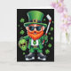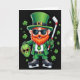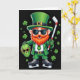 This greeting card features a charismatic leprechaun centered on a deep black background sprinkled with glowing green shamrocks ☘️. He wears an emerald suit with a matching top hat, a gold-buckled belt, and a shamrock tie, and his fiery orange-red beard spills beneath sleek black sunglasses. In one gloved hand he holds a metallic green hockey goalie mask, and in the other he grips a white-and-red hockey stick, like he’s showing it off to a close friend standing just out of frame 💚. Black ice skates anchor his stance, giving him a ready-to-glide posture that feels confident and inviting. The greeting appears near the top in bright green lettering, with a smaller line in lighter green placed below the figure near the bottom edge. Focused lighting catches the rich greens and warm beard tones, making the character stand out against the dark field of shamrocks. Share St. Patrick’s Day sentiments with someone special.